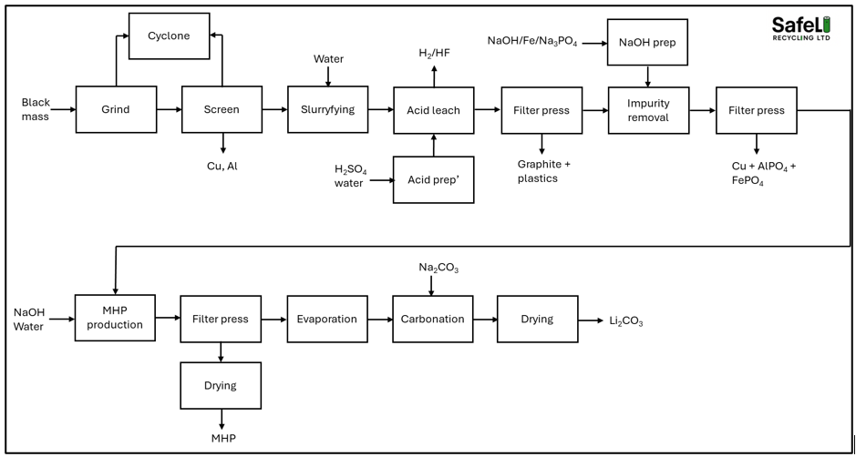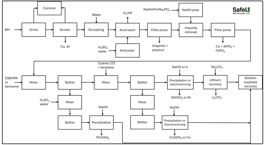 The most important criteria for any process is that it should operate safely and not cause harm to any person whether inside or outside the plant. The process should have sufficient engineering controls and systems in place to ensure all hazards are contained and do not leave the plant. Hazards include fire and explosions, exposure to toxic and poisonous chemicals such as HF and metal oxides found in black mass as well as other mechanical hazards normally found on a processing plant.