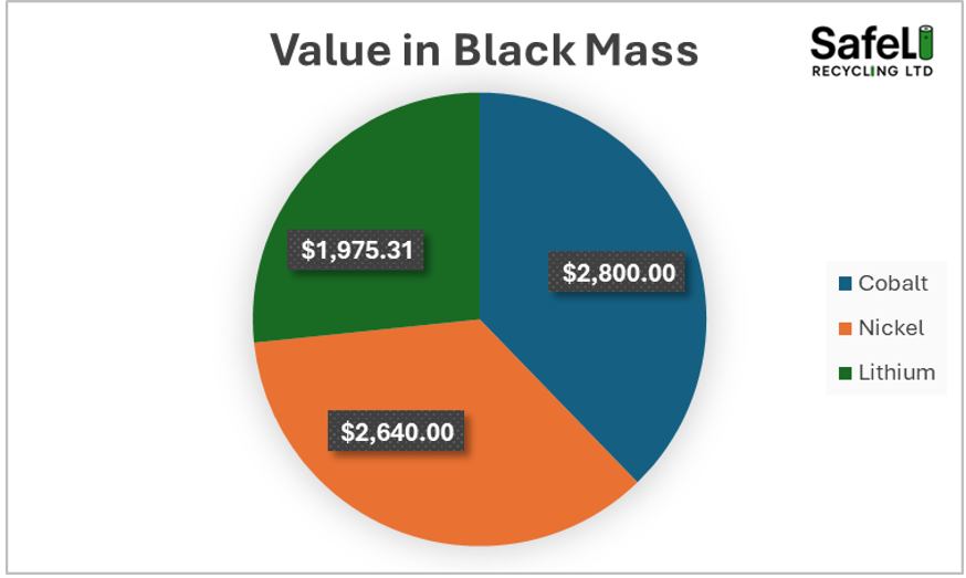 The answer to this question will be different for different but we can look at the proportion of the value that is attributed to lithium in a tonne of black mass and work from there. At the current price of cathodic metals (Ni = $15/kg, Co = $33/kg and Li = $53/kg), if we take an NMC 622 black mass with 58% CAM and 35% graphite (with the rest being impurities), the lithium accounts for only around 28% of the total value of the black mass or around £1,650 ($2,200).