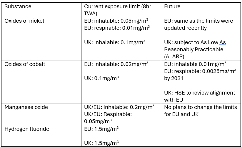 Whilst fires and explosions may be the most noticeable hazards associated with lithium ion batteries, they are not the main hazards on a battery recycling plant. Recycling plants have a number of engineering and administrative controls in place to reduce the chances of fire or explosions and they are generally rare occurrences where the effects are felt immediately. The main hazards on battery recycling plants are exposure to toxic and poisonous chemicals. Some of the chemicals found in lithium ion batteries are incredibly toxic and have extremely low exposure limits. Continuous exposure to even tiny amounts can cause serious long term health problems such as cancers and organ failure. The Table below shows the exposure limits for the main components of a lithium ion battery.