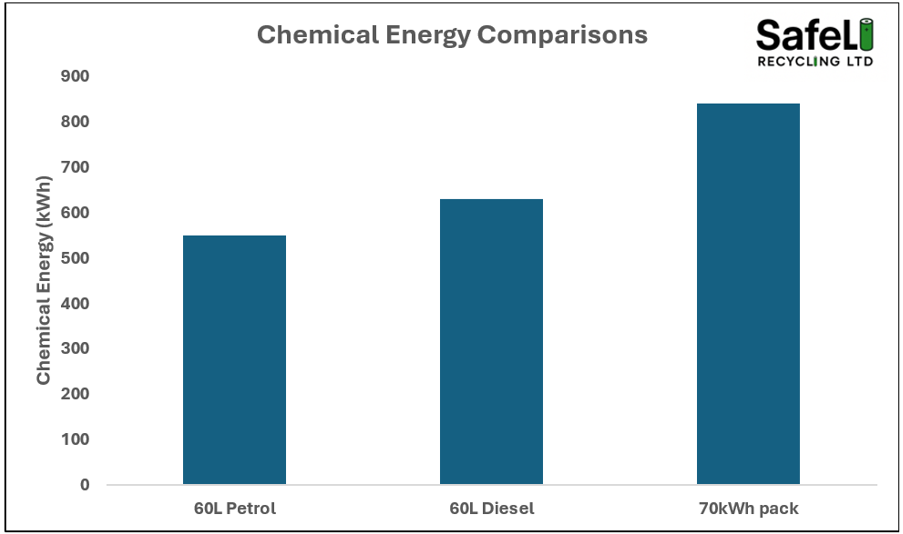 To put this into perspective, a medium sized 70kWh battery pack will contain upwards of 840kWh of chemical energy. The chart below shows that a battery pack contains more combustible chemical energy than typical petrol and diesel tanks.