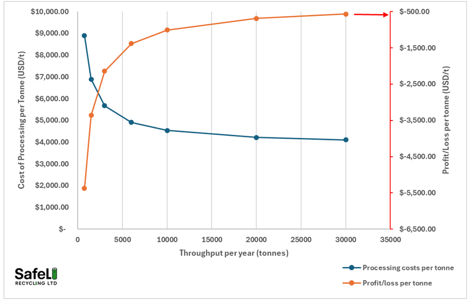 Figure 4. Cost of processing a tonne of black mass and profit/loss at given throughput using current prices for cathodic metals (Oct-2025)