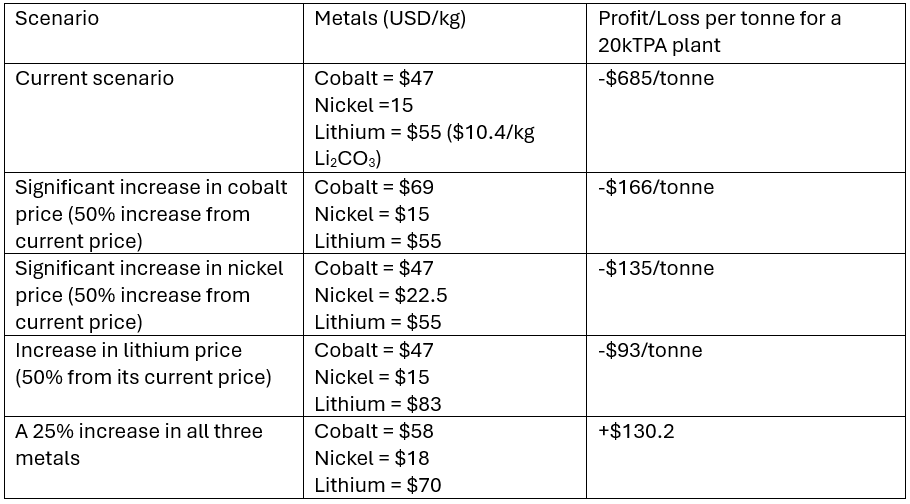 From the results in Table 2, we can see that the price of all cathodic metals needs to increase by 25% before a 20,000t/y hydrometallurgical plant begins to make economic sense in the UK (if it is processing only NMC 6:2:2). The plant will likely operate tactically to make the most of the swings in metal prices. For example, in scenario 2, when the cobalt price increases, the plant can switch to a higher cobalt input such as more LCO in the feed to make the most of the higher cobalt prices.