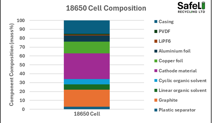Essentially it means the shredding companies must sell the copper and black mass to companies that can recover those elements at the required efficiencies. This can take the bargaining power away from the shred and sort companies and give it to the hydrometallurgical companies. The Table below shows a typical composition for an 18650 NMC 622 cell and the typical recycling efficiencies using the current system.