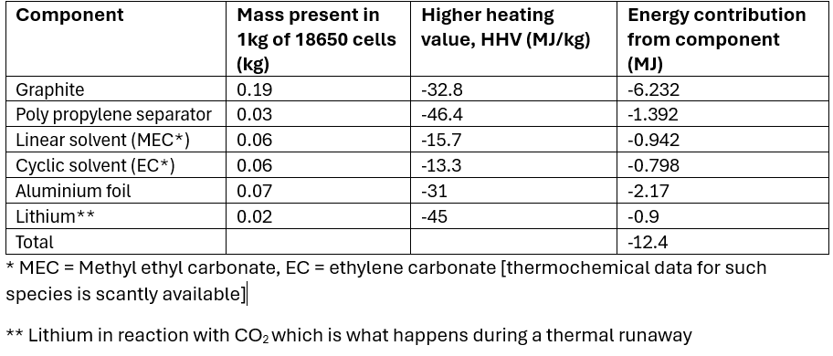 The next thing to look at is the energy that is present inside the cells. An18650 cell contains around 13Wh of electrical energy (3.5Ah @ 3.7V), however, this is not the only type of energy present within the cell. Remember that a battery is an electrochemical device as it converts chemical energy into electrical energy and vice versa. So, to enable that 13Wh of electrical energy, a lot chemicals energy must be present. Just how much chemical energy is present is shown in the table below.